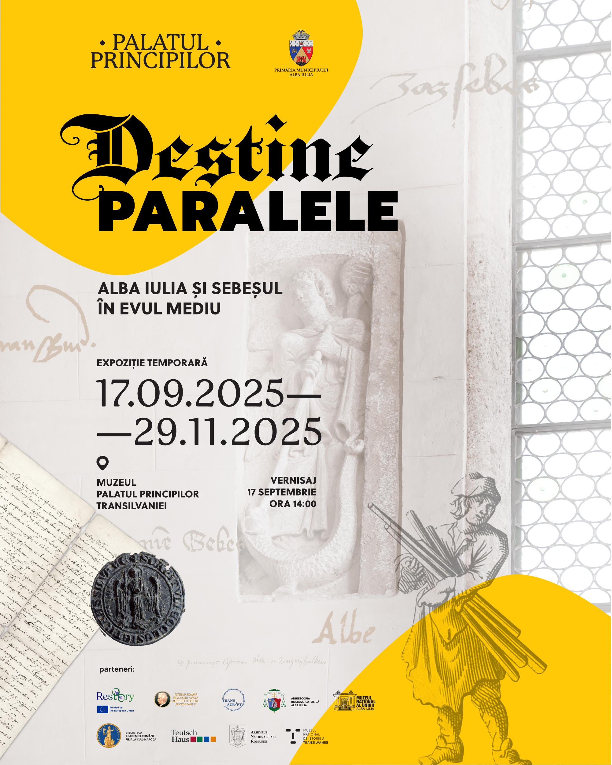 În perioada 17.09.2025–29.11.2025, Palatul Principilor din Alba Iulia, în parteneriat cu Centrul Trans.Script și alte instituții de cultură din România, organizează expoziția Destine Paralele: Alba Iulia și Sebeșul în Evul Mediu. Expoziția prezintă istoria medievală a unor așezări apropiate din punct de vedere geografic, dar foarte diferite în ceea ce privește statutul juridic, organizarea socială și structura economică: Alba Iulia, principala reședință a episcopilor Transilvaniei și Sebeșul, un oraș săsesc însemnat, ajuns la apogeu pe parcursul secolului al XIV-lea. Vernisajul va avea loc miercuri, 17 septembrie 2025, de la ora 14.00, la sediul Muzeului. Vă invităm cu drag!